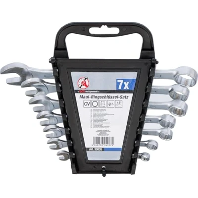 made of chrome vanadium steel hot forged satin chrome plated ring side 15° angled profile ring side: 12-point in plastic holder with handle combination spanner 6 - 8 - 10 - 11 - 13 - 14 - 17 mm, Weight: 1.0141264052 pounds, Manufacturer: BGS technic