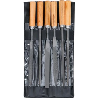 For precision filing work in tool and mould making. Application-oriented selection of most common files Versatile in use | for deburring, finishing, fitting and repair work With non-slip wooden handle for comfortable and safe work. Practical plastic bag is a clear storage solution Length: 100 mm. Handle type: wooden handle Box contents: 1 triangular file, 1 flat blunt file, 1 flat pointed file, 1 round file, 1 semi-circular file, 1 square file, Manufacturer: BGS Do it yourself