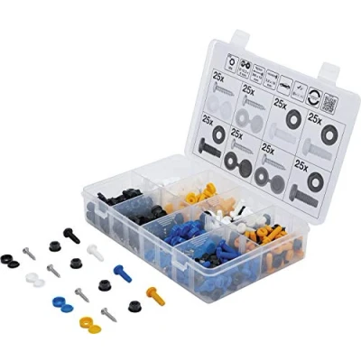 for attaching license plates to cars and motorbikes in plastic storage case scope of delivery: 25 self-tapping screws (stainless steel) 3.8 x 18 mm with white caps Ø 12.5 x 6 mm | 25 self-tapping screws (stainless steel) 3.8 x 18 mm with yellow caps Ø 12.5 x 6 mm | 25 self-tapping screws (stainless steel) 3.8 x 18 mm with blue caps Ø 12.5 x 6 mm | 25 self-tapping screws (stainless steel) 3.8 x 18 mm with black caps Ø 12.5 x 6 mm | 25 plastic screws (white) M6 x 19 mm with black M6 plastic nuts | 25 plastic screws (yellow) M6 x 19 mm with black M6 plastic nuts | 25 plastic screws (blue) M6 x 19 mm with black M6 plastic nuts | 25 plastic screws (black) M6 x 19 mm with black M6 plastic nuts, Manufacturer: BGS Do it yourself
