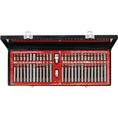 made of chrome vanadium steel in metal case 7 bits, length: 30 mm, internal hexagon 4 - 5 - 6 - 7 - 8 - 10 - 12 mm | 7 bits, length: 75 mm, internal hexagon 4 - 5 - 6 - 7 - 8 - 10 - 12 mm 5 bits, length: 30 mm, spline (for XZN) M5 - M6 - M8 - M10 - M12 | 5 bits, length: 70 mm, spline (for XZN) M5 - M6 - M8 - M10 - M12 7 bits, length: 30 mm, T-Star (for Torx) T20 - T25 - T30 - T40 - T45 - T50 - T55 | 7 bits, length: 70 mm, T-Star (for Torx) T20 - T25 - T30 - T40 - T45 - T50 - T55 7 bits, length: 30 mm, T-Star tamperproof (for Torx) T20 - T25 - T30 - T40 - T45 - T50 - T55 | 7 bits, length: 70 mm, T-Star tamperproof (for Torx) T20 - T25 - T30 - T40 - T45 - T50 - T55 1 bit adapter with retaining ball, 10 mm (3/8") drive, internal hexagon 10 mm (3/8") | 1 bit adapter with retaining ball, 12.5 mm (1/2") drive, internal hexagon 10 mm (3/8"), Manufacturer: BGS Do it yourself
