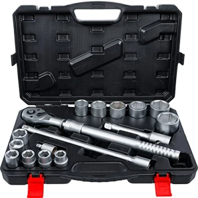 ideal for powerful use on commercial vehicles, tractors and machines | compact set with 12 sockets from 19 - 50 mm, 2 extensions 200 and 400 mm and a socket adapter from 20 mm (3/4") to 12.5 mm (1/2") with telescopic reversible ratchet for high power transmission with low power input | right-/left-handed rotation switchable by lever | push button release | telescopic shaft lockable from 510 - 760 mm | in sturdy plastic case output profile: hexagon | drive profile size, metric: 20 mm | drive profile: internal square | drive profile size, inch: 3/4" material: carbon steel | surface finish: satin chrome plated | of teeth in ratchet head: 24 scope of delivery: 1 reversible ratchet, extendable, external square 20 mm (3/4") drive, length 510 - 760 mm | 12 sockets, 20 mm (3/4") drive, hexagon 19 - 21 - 22 - 24 - 27 - 30 - 32 - 36 - 38 - 41 - 46 - 50 mm | 2 extension bars, external/internal square 20 mm (3/4"), length 200 and 400 mm | 1 socket adaptor, external/internal square 20 mm (3/4"), Manufacturer: BGSDIY