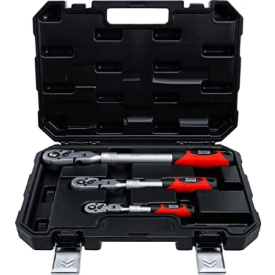For tightening and loosening fixed screw connections, long and telescopic and angled lever arm for high torque, lockable in different levels with a self-locking ring With practical quick release for easy change of socket spanner inserts, non-slip and ergonomically shaped 2-component handle for safe and comfortable working, all reversible ratchets with flexible, angled ratchet head, swivels by 180° Ratchet head with lever switch to change the screw direction (clockwise anti-clockwise), ball lock guarantees a firm and secure hold of the socket spanner inserts on the output square Output profile: external square, material: chrome vanadium steel, surface coating: chrome-plated, matt, number of teeth ratchet head: 72, handle type: 2-component handle Box contents: 1 reversible ratchet, extendable, angled, external square drive 6.3 mm (1/4 inch), 4-way extension, ratchet head can be angled in 6 positions, maximum length 225 mm, 1 reversible ratchet, extendible, external square output 10 mm (3/8 inch), 5-way extendible, ratchet head in 8 positions. angled, maximum Length 350 mm, 1 reversible ratchet, extendable, angled, external square drive 12.5 mm (1/2 inch), 6-way extension, ratchet head can be angled in 10 positions, maximum length 490 mm, Weight: 6.6248909731 pounds, Manufacturer: BGS Do it yourself