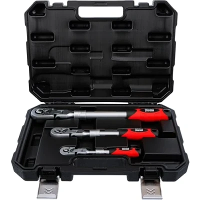 For tightening and loosening fixed screw connections, long and telescopic and angled lever arm for high torque, lockable in different levels with a self-locking ring With practical quick release for easy change of socket spanner inserts, non-slip and ergonomically shaped 2-component handle for safe and comfortable working, all reversible ratchets with flexible, angled ratchet head, swivels by 180° Ratchet head with lever switch to change the screw direction (clockwise anti-clockwise), ball lock guarantees a firm and secure hold of the socket spanner inserts on the output square Output profile: external square, material: chrome vanadium steel, surface coating: chrome-plated, matt, number of teeth ratchet head: 72, handle type: 2-component handle Box contents: 1 reversible ratchet, extendable, angled, external square drive 6.3 mm (1/4 inch), 4-way extension, ratchet head can be angled in 6 positions, maximum length 225 mm, 1 reversible ratchet, extendible, external square output 10 mm (3/8 inch), 5-way extendible, ratchet head in 8 positions. angled, maximum Length 350 mm, 1 reversible ratchet, extendable, angled, external square drive 12.5 mm (1/2 inch), 6-way extension, ratchet head can be angled in 10 positions, maximum length 490 mm, Weight: 6.6248909731 Pounds, Manufacturer: BGS Do it yourself