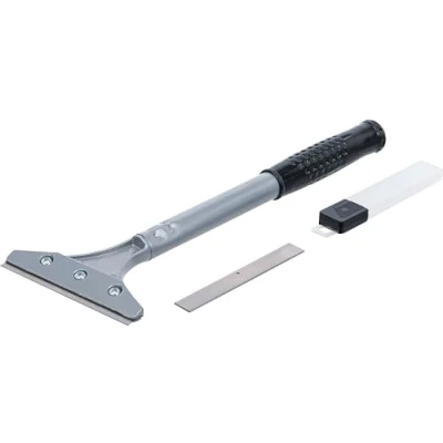 Universal use on walls and floors For removing stubborn residues from paints, wallpaper and glues Flexible use for various cleaning tasks Blade changing device and 5 blades, slightly bevelled head, with tubular steel handle Handle type: rubber | length: 300 mm | blade width: 100 mm, Manufacturer: BGS Do it yourself