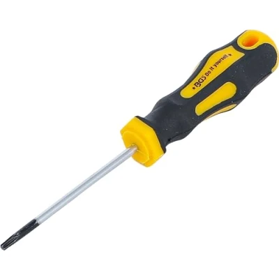 with round blade and black tips | ergonomic 2-component handle head stamping with output profile symbol and size | roll-off protection against rolling away due to asymmetric handle shape with hanging hole handle type: 2 component handle | material: chrome vanadium steel output profile: T-Star (for Torx) | output profile size: T9 | blade length: 60 mm, Manufacturer: BGS Do it yourself