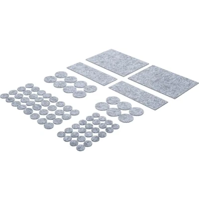Self-adhesive, sliding aid and noise insulation for chairs and other small furniture Floor-friendly movement of furniture on all hard, smooth floor surfaces. Protects smooth surfaces such as laminate, parquet, plastic or stone floors Also suitable for objects such as speaker boxes, lamps or decorative objects. For use on clean, dry and grease-free surfaces Thickness: 3 mm. Colour: mottled grey Box contents: 24 felt pads, round, diameter 18 mm, 32 felt gliders, round, diameter 22 mm, 14 felt gliders, round, diameter 35 mm, 8 felt glider plates, 150 x 13 mm, 2 felt glider plates, 150 x 115 mm