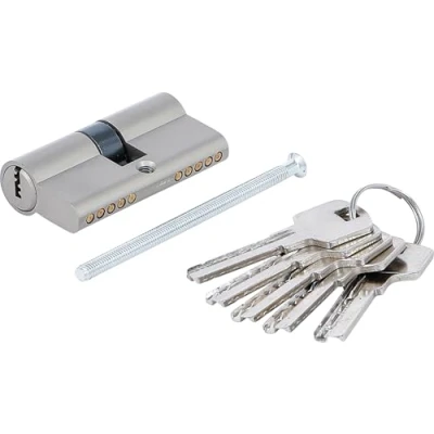 solid cylinder housing | has a large number of robust security functions can be used for indoor and outdoor areas | suitable for all door types such as timber, metal and PVC doors can be locked from both sides | with 5 keys cylinder length: 60 mm | size: 30/30 mm | material: brass core with brass case | surface finish: satin chrome plated scope of delivery: 1 security cylinder lock, 60 mm | 1 fixing screw 85 mm | 5 keys, Weight: 0.49361500461799995 Pounds, Manufacturer: BGS Do it yourself
