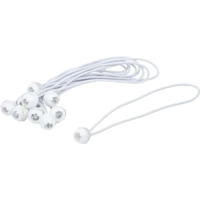 perfect for attaching tents, nets, tarpaulins, advertising banners and canopies | easy application can be attached in a matter of seconds | offer many advantages over conventional fastening methods pull the rubber through both eyelets for fastening and slip the loop over the ball | highly elastic rubber ropes with excellent toughness, elasticity and load-capacity due to latex core | robust and long-lasting | can be reused | weather- and UV-resistant material: polypropylene (PP) | material thickness: 4 mm | length: 270 mm | stretching: 450 mm | ball diameter: 25 mm