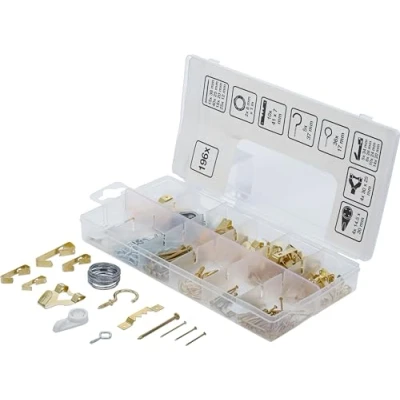 extensive picture hook assortment consisting of 196 parts | consisting of hooks, wire, nails and hangers suitable for easy attachment of pictures, calendars, etc. | in a practical assortment box for clear storage and transport scope of delivery: 14 picture hooks, brass-coated, 20 mm | 10 picture hooks, brass-coated, 24 mm | 8 picture hooks, brass-coated, 26 mm | 5 picture hooks, brass-coated, 34 mm 25 nail pins, brass-coated, 12 mm | 18 nail pins, brass-coated, 20 mm | 40 nail pins, brass-coated, 25 mm | 15 nail pins, brass-coated, 38 mm | 5 screw hooks, brass-coated, 37 mm 4 concrete wall hooks, white 14.5 x 30 mm | 2 picture wire rolls, 8 mm x 1 m | 10 wall hooks, brass-coated, 41 x 7 mm | 4 picture hooks, brass-coated, 30 x 25 mm | 36 eye bolts, Weight: 0.4850169764 Pounds, Manufacturer: BGS Do it yourself