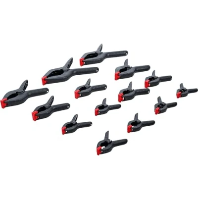 with adjustable jaws steel spring jaw material: polyethylene (PE) handle material: nylon scope of delivery: 6 clamps, length: 75 mm, clamping range: 0 - 38 mm | 4 clamps, length: 100 mm, clamping range: 0 - 44 mm | 2 clamps, length: 150 mm, clamping range: 0 - 63 mm | 2 clamps, length: 225 mm, clamping range: 0 - 88 mm, Weight: 1.73283337932 pounds, Manufacturer: BGS Do it yourself