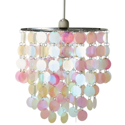 General description Add a girly touch to your child's bedroom with the Glow Iridescent Easy to Fit Shade in Silver. This iridescent ceiling light shade features tiers of circular discs that reflect light in a playful and colorful pattern around your room. Transform your room's aesthetic quickly with the Easy Fit feature, requiring no external assistance. Technical specifications Product Type: Easy Fit Shade Bulbs Required: 1 (Not Included) Bulb Type: Simply attaches to existing fitting Max Bulb Wattage: 10 Watt Height: 32 cm approx. Diameter: 30 cm approx. Material: Metal, Plastic Colour: Multi Coloured