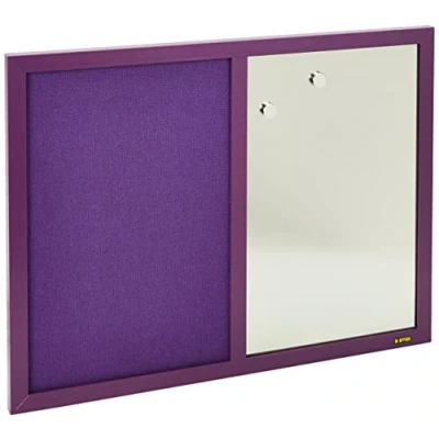 22mm MDF frame with purple coating Double surface for double use, magnetic dry erase board on one side and fabric notice board on the other Magnetic dry erase surface with Silverfinish Fabric surface in purple Supplied with 6 pushpins, marker with eraser, 2 magnets and wall fixings.
