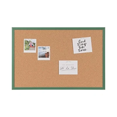 60 x 40 cm cork note board with green MDF frame Ideal for attaching notes with push pins 100% cork surface that does not retain damage from push pins Included are 5 push pins and a wall mounting kit