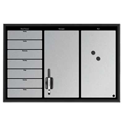 60 x 40 cm planner with MDF frame in black Ideal for organising tasks, messages and notes Dry erase magnetic surface allows use of magnets Included are 1 marker, 1 blackboard cleaner, 2 magnets and 1 wall mounting kit