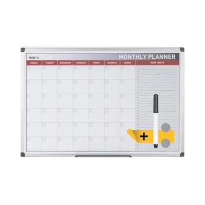 A versatile planning tool that allows you to organise tasks during the coming month High quality dry wipe magnetic surface Easy to write on and wipe off Supplied with marker pen, pen tray, magnets and wall mounting kit.