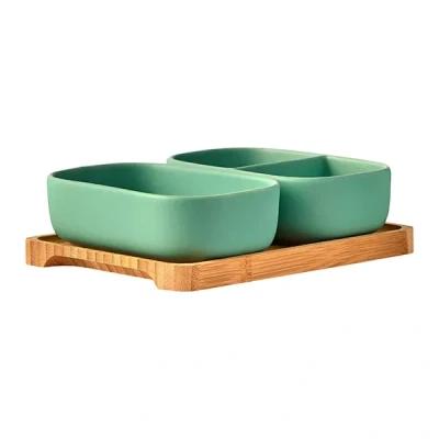 The BIA International Share Set of 2 Rectangular Bowls Green are made from durable stoneware and matte glaze in a solid green colour.Complete with a wooden bamboo tray for serving.The square serving bowls are oven, freezer and dishwasher safe without the bamboo tray and can be used to share nibbles and snacks when entertaining or just at home on the table for casual dining.Complete with a stylish gift box these serving bowls have a 250ml capacity.Size: 4.5(H) x 9(W) x 14(L)cm.