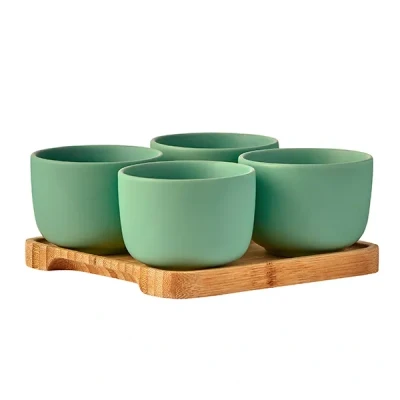 The BIA International Share Set of 4 Round Bowls Green are made from durable stoneware and matte glaze in a solid green colour.Complete with a wooden bamboo tray for serving.The round serving bowls are oven, freezer and dishwasher safe without the bamboo tray and can be used to share nibbles and snacks like hummus and veggie stick or sweets and nuts when entertaining.Complete with a stylish gift box these serving bowls have a 150ml capacity.Size: 6(H) x 8(W) x 8(L)cm.
