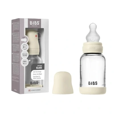 BIBS Baby Glass Bottle. 120ml. Anti Colic. Vented Round Silicone Nipple. Supports Natural Breastfeeding, Slow Flow, Complete Set 120 ml, Ivory