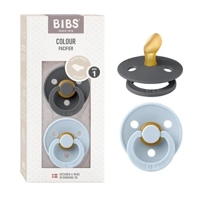 BIBS Colour Anatomical Soother 2 Pack, BPA Free Dummy Pacifier, Orthodontic Nipple. Natural Rubber Latex, Made in Denmark. 0 6 Months (Pack of 2), Iron/Baby Blue
