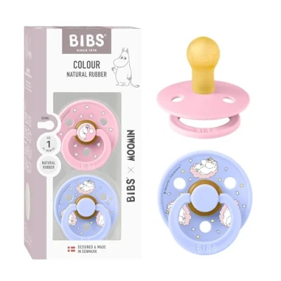 BIBS Colour Moomins Soother 2 Pack, BPA Free Dummy Pacifier, Round Nipple. Natural Rubber Latex, Made in Denmark, Size 1 (0 6 Months), Baby Pink/Hush