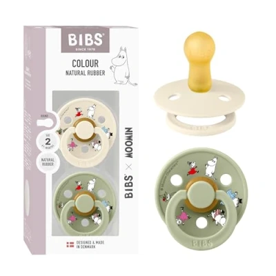 BIBS Colour Moomins Soother 2 Pack, BPA Free Dummy Pacifier, Round Nipple. Natural Rubber Latex, Made in Denmark, Size (6 18 Months), Ivory/Sage
