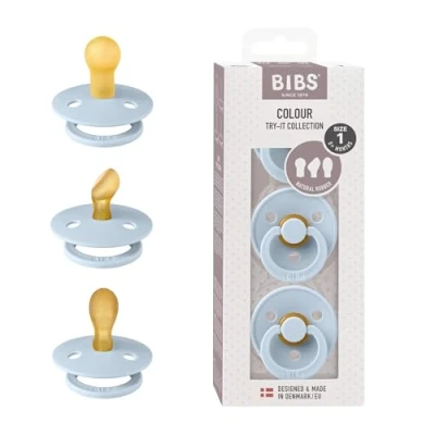 Explore the BIBS Colour Try-It Collection, featuring three soothers with round, symmetrical, and orthodontic nipple options, allowing you to find the perfect pacifier for your baby's individual preferences. Customizable Comfort: With different nipple shapes and sizes, our pacifiers cater to various sucking techniques and mouth anatomies, ensuring your baby's ultimate comfort and satisfaction during soothing moments. Natural Rubber Latex: Crafted from high-quality natural rubber latex, these pacifiers offer a soft and flexible feel, closely resembling the texture of a mother's breast, enhancing the soothing experience for your little one. Optimal Development: Designed to support healthy oral development, our pacifiers are carefully shaped to encourage proper tongue placement and jaw alignment, promoting the natural growth of your baby's mouth. Colorful and Fun: The BIBS Colour Collection not only offers functional benefits but also adds a touch of style to your baby's pacifier collection. With an array of vibrant colors, these pacifiers are as visually appealing as they are soothing.