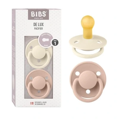 BIBS De Lux Soother 2 Pack, BPA Free Dummy Pacifier, Round Nipple. Natural Rubber Latex, Size 1 (0 6 Months), Ivory/Blush