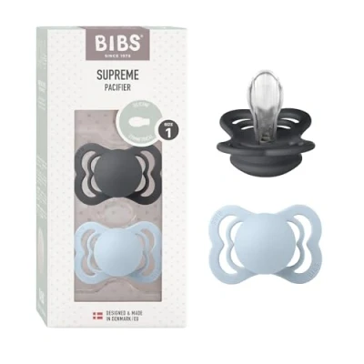 BIBS Supreme Soother 2 Pack, BPA Free Dummy Pacifier, Symmetrical Nipple. Silicone, Size 1 (0 6 Months), Iron/Baby Blue