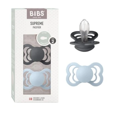 BIBS Supreme Soother 2 Pack, BPA Free Dummy Pacifier, Symmetrical Nipple. Silicone, Size (6 18 Months), Iron/Baby Blue
