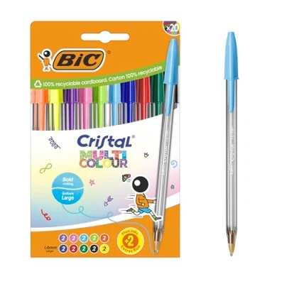 This pen comes in both classic and hip eye-catching colours (including 2 neons); a colourful cocktail to brighten up your notebook Make a thicker more intense impression with the wide 1.6 mm tip; writing has never been so full of life and colour Quick and easy notetaking with this ballpoint pen’s perfectly round ball for flawless ink flow BIC's legendary hexagonal barrel: simple, functional, iconic design; maximum efficiency - and the caps and tops match the ink colour This 20-pack has classic inks (blue, black, green, red), fun colours (turquoise, lime green, pink, purple), and neons (orange, yellow)