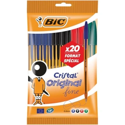 With its fine nib of 0.8 mm, the BIC Cristal Original Fine pen will appeal particularly to lovers of fine and precise writing Change colour without changing style, these 20 pens come in 4 colours: blue (x8), black (x5), red (x4), green (x3) Built to last, the BIC Cristal Original Fine Ballpoint Pen writes an average of 3.5 km (Black and Blue inks) Its translucent orange barrel shows the ink level: sleek, functional design, recognized. Nothing superfluous Made in France with minimal material, this pen is certified by NF Environnement. Bravo BIC