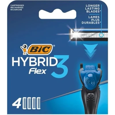 Contains triple-blade 4 refill cartridges for the BIC Hybrid 3 Flex men's shaver 3 nano-tech titanium moveable blades adjust to every contour for a smooth shave and easy rinsing The wide guard bar stretches the skin before the blades reach the hair for superior precision Enjoy the soothing glide of the wide lubricating strip enriched with Vitamin E and Aloe Vera Recyclable packaging