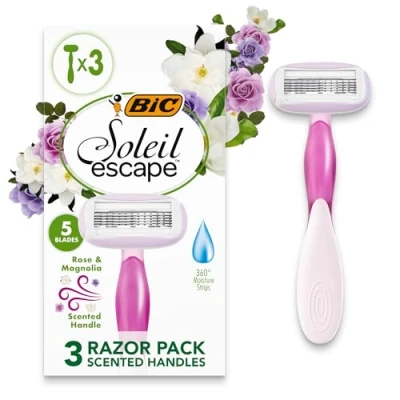 A box of 3 BIC Soleil Escape 5-Blade Rose and Magnolia women's razors with 5 long-lasting movable blades for a close, comfortable shave Enjoy easy handling with the curved handle that's scented with rose and magnolia for a pleasant shaving experience The 360° water-activated moisture strips enriched with almond oil create effortless glide and a smooth shave This non-refillable razor eliminates every hair with its pivoting head that gently hugs all your curves Wet soapy hands still maintain total control with the rubber grip