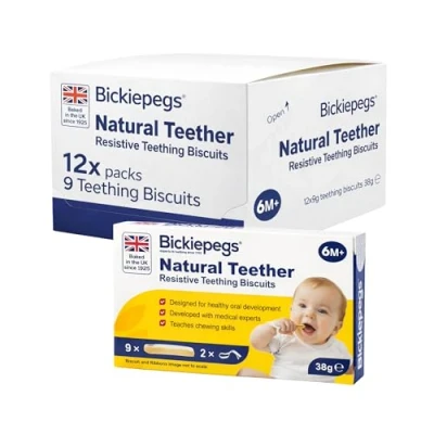 TRADITIONAL TEETHING REMEDY FOR OVER 100 YEARS – A trusted alternative to teething gels and toys. Helps soothe teething discomfort as babies bite and chomp down, offering calming relief and a safe outlet for teething tension. NATURAL & SIMPLE INGREDIENTS – Made only with wheat flour, wheat germ, and water. No added sugar, salt, flavourings, or preservatives. Lactose-free and made with minimal ingredients to protect your baby’s developing taste and appetite for meals. HYGIENIC SINGLE USE TEETHING STICKS – Each pack includes 9 biscuits, each can be used for up to 20 minutes under supervision. Includes 2 reusable safety ribbons that attach to your baby’s clothes to prevent drops. DESIGNED FOR YOUR BABY'S DEVELOPMENT – Finger-shaped for easy holding and made to suit little mouths and developing jaws. Helps babies practise biting and chewing under adult supervision as part of normal oral development. INTRODUCE BABIES TO SOLIDS – Firm, resistive teething biscuits that do not crumble easily. Designed to give babies a safe surface to bite and explore, the biscuits help babies build early chewing skills and confidence with harder textures.