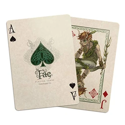A Custom deck of playing cards featuring beings from the Realm of The Fae. Creatures and being from both the Seelie and Unseelie Courts of Faerie. Linen finish, USPCC Premium (Bee) stock with a Traditional Cut. Hand drawn artwork, unique custom face cards and custom pips. 52 cards plus two unique jokers, one double backed card and a card identifying all the Fae. Made in the USA by the United States Playing Card Company (USPCC), Manufacturer: Gent Supply Co.