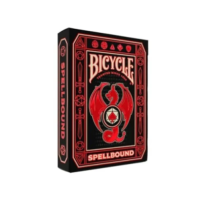 RECOLORED COURT CARDS – Crimson and grey, with upgraded weapons. CUSTOM ACES – Gain a buff to your hand CUSTOM CARD BACKS – Featuring polyhedral dice, swords and dragons. “SPELL” CARDS AND INSTRUCTIONS – Learn to play Bicycle Spellbound. RED HOLOGRAPHIC FOIL TUCK AIR CUSHION FINISH, Manufacturer: Cartamundi Deutschland GmbH
