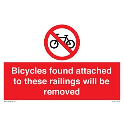 P913 : No cycling This sign is made from plastic semi rigid 1mm self adhesive A4 landscape Sign Text: Bicycles found attached to these railings will be removed
