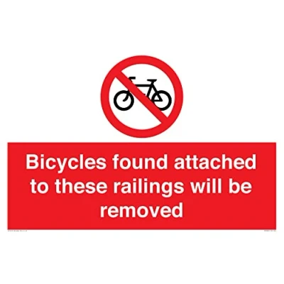 P913 : No cycling This sign is made from vinyl / sticker Air Release vinyl makes it easy to stick to flat, clean surfaces without bubbles. Not for rough, plastic or dusty surfaces. A2 landscape Sign Text: Bicycles found attached to these railings will be removed