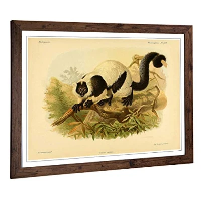 Big Box Art Framed Print of Vintage J.G. Keulemans Black & White Ruffed Lemur Design Wall Picture Home Decor for Kitchen, Living Room, Bedroom, Hallway, Walnut, A2 / 24.5x18 Inch 62x45cm
