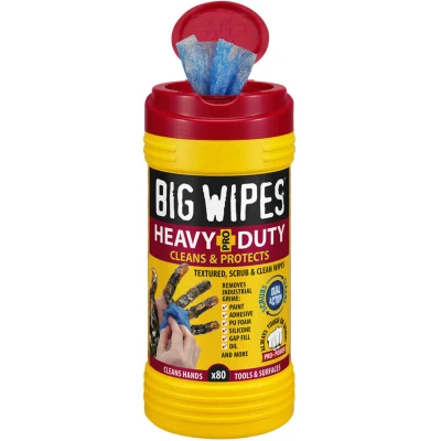 General description Big Wipes Heavy-Duty Pro+ are high-performance, dual-sided, textured wipes designed for effective cleaning and disinfecting. They quickly grab and remove stubborn muck and grime, making them ideal for tradespeople and anyone needing heavy-duty cleaning solutions. These wipes are capable of removing paint, oil, PU foam, silicone, grease, gap fill, adhesive, and more from hands, tools, and surfaces. Technical specifications Pack Quantity: 80 wipes Type: Heavy-Duty MPN: 2420 0000 EAN: 5060065661818 Usage Use without water for heavy-duty cleaning of hands, tools, and surfaces. The scrub face of the wipe effectively removes stubborn grime, while the smooth face absorbs excess dirt. These wipes are particularly beneficial for tradespeople on the move. Other information Certified antiviral (EN14476) and antibacterial (EN1276) Dermatologically tested with four skin conditioners: Aloe Vera, Lanolin, Vitamin E, and Glycerine Free of artificial preservatives, parabens, and