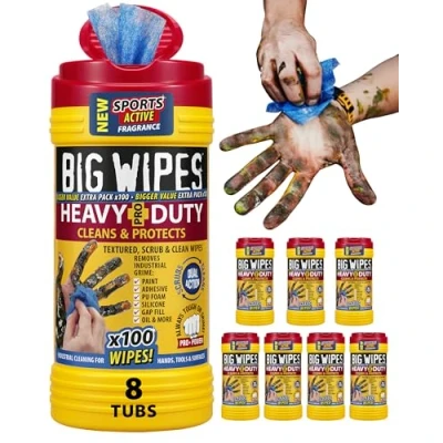 Dual-Sided Power Fabric: These industrial wipes remove the toughest dirt, grease and oil with ease. The textured side tackles grime fast, while the smooth side absorbs residue for a spotless finish on hands and tools. 4x Cleaning Power Formula: Engineered as cleaning wipes heavy duty, they contain 4x powerful bio-based solvents that cut through paint, sealants, adhesives and more. Designed for professionals who need fast and efficient cleaning. Built for Hands, Tools & Workspaces: More than just for your hands, these surface wipes clean tools, equipment, and hard surfaces without tearing or pilling. Each wipe delivers a reliable, mess-free solution wherever work takes you. Gentle on Skin, Tough on Grime: Infused with Aloe Vera, Lanolin, Vitamin E and Glycerine, these multi surface wipes nourish and protect skin during tough cleans. With 0 skin irritation, they leave hands clean and conditioned after every use. Big Wipes, Big Results: Our wipes feature a water-based formula for a safer, greener clean. It’s for tradespeople who want high performance without harsh chemicals or environmental impact
