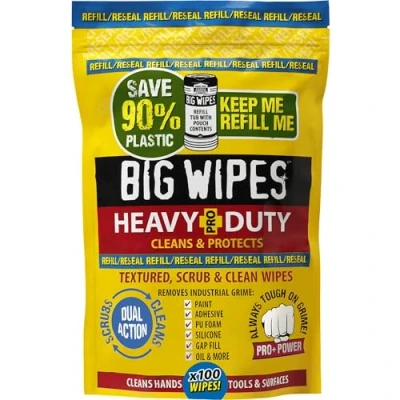 SCRUB STUBBORN MUCK OFF YOUR HANDS AND TOOLS - Big Wipes Heavy Duty Pro+ industrial wipes swiftly remove paint, oil, sealants, PU foam, and more for clean hands and tools on the go, while keeping them smelling fresh with a sports active fragrance! DUAL-SIDED 'SCRUB AND CLEAN' FABRIC – packed with 4x powerful cleaning solvents each heavy-duty wipe has a textured side for stubborn grime and dirt removal and a smoother side to soak up excess muck and moisture quickly INDUSTRIAL BY DESIGN - with a tear-resistant and non-slip construction that doesn't pill, our durable industrial wipes are designed to tackle the toughest grime, whether cleaning up at the start or end of a job. Each pouch contains 100 wipes SKIN MOISTURISING - your hands are your most valuable tools - nourish and protect them in the harshest industrial environments. Dermatologically tested & non-toxic with Aloe Vera + Vitamin E. Free from parabens, phosphates, sulphates & formaldehyde HEAVY-DUTY CLEANING FOR TRADESPEOPLE - since 2003, Big Wipes has been helping millions of professionals save time every working day thanks to a range of industrial cleaning wipes, sprays and specialist mobile cleaning solutions, Weight: 1.322773572 pounds, Manufacturer: Big Wipes