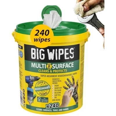 Total Jobsite Essential: These industrial wipes are engineered to clean hands, tools and surfaces quickly and efficiently. Each wipe delivers high-performance cleaning that powers through grime while remaining gentle on skin. Power That Lasts All Day: Our cleaning wipes heavy duty formula combines 4 natural power solvents with skin conditioners for unmatched cleaning. Easily remove paint, sealant and adhesives while protecting your hands from dryness. Ready for Every Mess: These surface wipes are designed to tackle dirt oil and grime on all materials, from metal and wood to plastic and worktops. Their durable fabric technology ensures maximum absorption and no residue left behind. Wipe Away the Toughest Stains: Our multi surface wipes work fast to lift paint, adhesives and other stubborn marks that ordinary wipes can’t handle. Ideal for trade professionals who need a spotless finish on the job. The All-Rounder You Can Rely On: Big Wipes is ideal for quick clean-ups in workshops, vans and job sites. Keep them in your kit or vehicle for a convenient, all-in-one cleaning solution., Manufacturer: Big Wipes