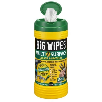 General description Multi-Surface BIG WIPES are versatile, eco-friendly cleaning wipes designed to remove stubborn dirt, grease, paint, and liquids from various surfaces. They are suitable for both professional and domestic use, providing powerful cleaning while protecting and hydrating the skin. Enriched with natural skin conditioners, these biodegradable wipes are effective and environmentally friendly. Technical specifications Contents: 80 wipes per container Material: Biodegradable viscose fabric Formulation: Water-based, free from parabens, sulfates, phosphates, and harmful chemicals Environmental impact: Biodegradable, compostable, recyclable Certified antiviral (EN14476) and antibacterial (EN1276) Compatibility and accessories Suitable for most non-porous surfaces in professional and home environments. Can be used on skin for hydration and protection. Installation Open the container and remove a wipe. Use directly on surfaces or skin as needed. Dispose of used wipes in compost