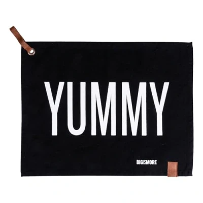 Bigismore placemat in fabric: 60% cotton (recycled) and 40% polyester 300 GSM inserts in cotton blend fabric with PU coating Hanging loop Decoration with inscription: YUMMY Measurements: L. 45 x d. 35 cm. Colour: black, white lettering, brown inserts. Washable at 40 °C. Do not bleach. Do not tumble dry. Iron at medium temperature. Do not dry clean Bigismore Placemat, Fabric: 60% Cotton (Recycled) and 40% Polyester; 300 GSM Inserts in cotton blend fabric with PU coating; Eyelet for hanger; Decoration with inscription: YUMMY Size: L 45 x 35 cm; colour: black, white lettering, brown inserts; washable at 40 °C Do not bleach; Do not tumble dry; Iron on medium heat