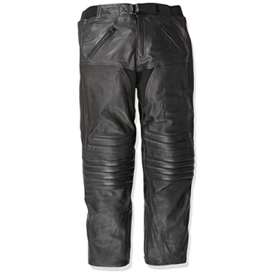 Made of a comfort fit all black 1.2mm - 1.3mm cowhide leather. Padded knee & double stitched. All genuine ykk zips on fly, and on legs of pants. Two zip pockets on front of pants and Velcro buckles adjustment. Stretch panels in the calf area & semi stretch waistband. Full stretch panel down each side of leg for added comfort and fit. Stretch panel across the back of pants and an 8 inch zip for fixing to jacket. CE Aproved Armour in Knee and Hip Padding Protection (fully removable)