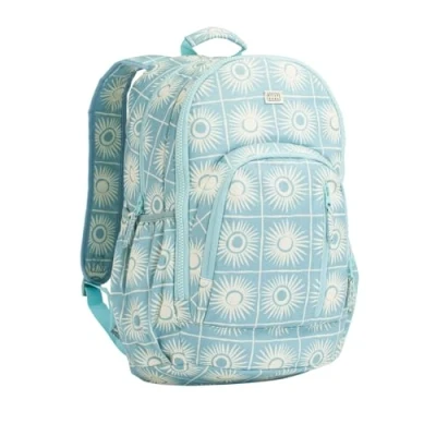 Fabric: recycled polyester __Compartments:__ Mesh back panel, laptop compartment inside, elastic side pockets for water bottles, pencil pockets inside, mesh pockets with zip Zips: outer zips made of moulded nylon mix __Strap:__ Padded, adjustable shoulder straps Volume: 31 L
