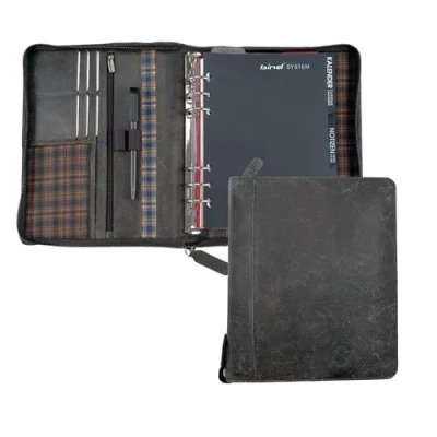 High-quality system planner folder from bind, made of split washed leather in a vintage look in brown and checked lining inside With zip compartment, 2 writing instrument loops, 1 pen and 6 business card pockets Features: 6-lingual (D / E / F / S / I / NL) "Manager-Plus" system insert A5 (see product description) and appointment calendar: 1 week = 2 pages - each from September for the following year All-round metal zipper with Velcro device for zipper, for safe storage of documents and utensils Dimensions: approx. 24.5 × 20 × 4 cm, calendar format: A5, material: split washed leather with a vintage look, color: brown