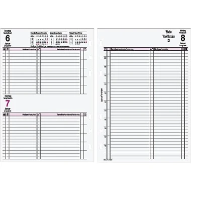 BIND - Daily calendar insert in DIN A5 format for the calendar year 2025 1 day = 1 page, columns divided for appointments and notes, names of the days of the week and months, 3 languages (D / E / F) as well as preview for the previous month, current month and following month Manager calendar format A5 (149 x 210 mm), material: paper, colour: white, for the year: 2025 Standard punching: hole spacing: 13 / 13 / 59 / 13 / 13 mm Ideal for the binding system for the various Bind Duo system planners, diary and ring binder planners, but also suitable for planners of other brands with standard perforations