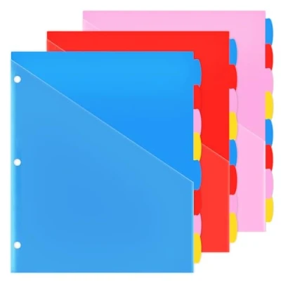 📊 Clear Front Pocket: Each tab divider comes with a front transparent pocket, which provides big storage for loose papers, also offers you clear and easy browsing. Inclined design makes it easy to put and take, keeping your file from falling out and getting wet. Practical pocket dividers. 📊 Dividers with Extra Big Tabs: With large tabs, these pocket dividers make it easy to organize and display notes and documents for quick and easy access for school or work(Includes customized labels). Large tabs allow twice as much write space as standard divider tabs. 📊 Fits 3 Ring Binders: WOT I plastic dividers are ideal for frequent use in standard 3 ring binders. Come with 8-tab set, pack of 3 Sets, totally 24 tabs. 📊 4 Bright Colors: Multiple colors designed brightens up your home or office and make filing easier. 📊 Wide Applications: high-quality plastic dividers are made of ultra-durable and tear-resistant plastic, which is very suitable for school work, office projects and reference materials.